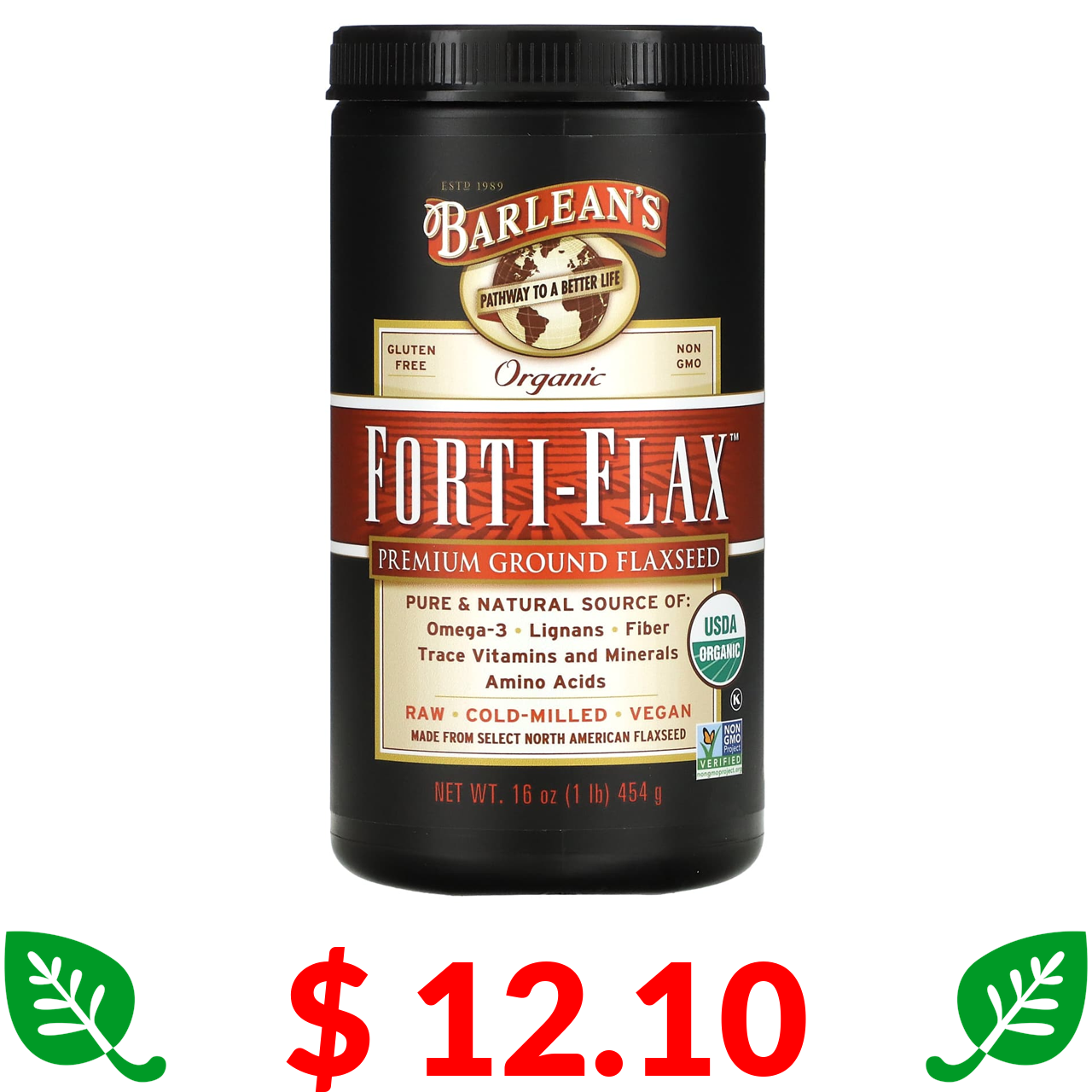 $ 12.10 Barlean's, Органічний Forti-Flax, мелене насіння льону преміум-класу, 16 унцій (454 г)