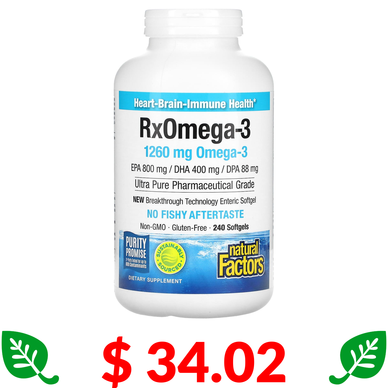 $ 34.02 Natural Factors, Rx Omega-3, риб’ячий жир, 800 мг ЕПК і 400 мг ДГК, 240 капсул