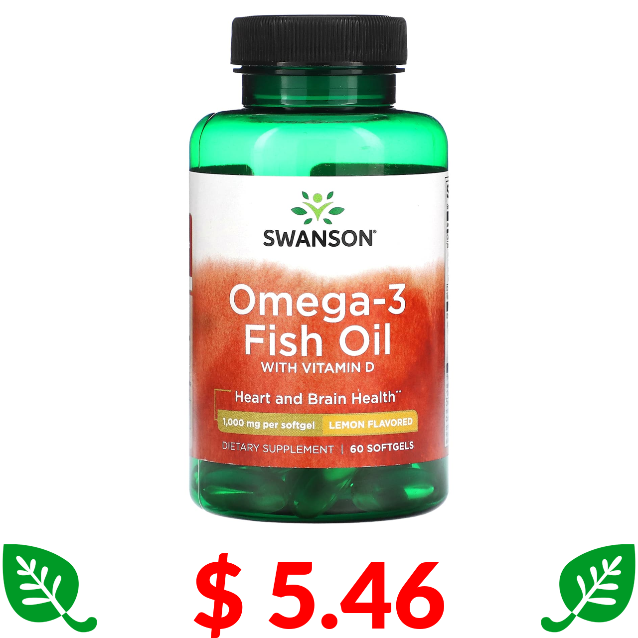 $ 5.46 Swanson, риб’ячий жир із омега-3 з вітаміном D, лимон, 1000 мг, 60 капсул