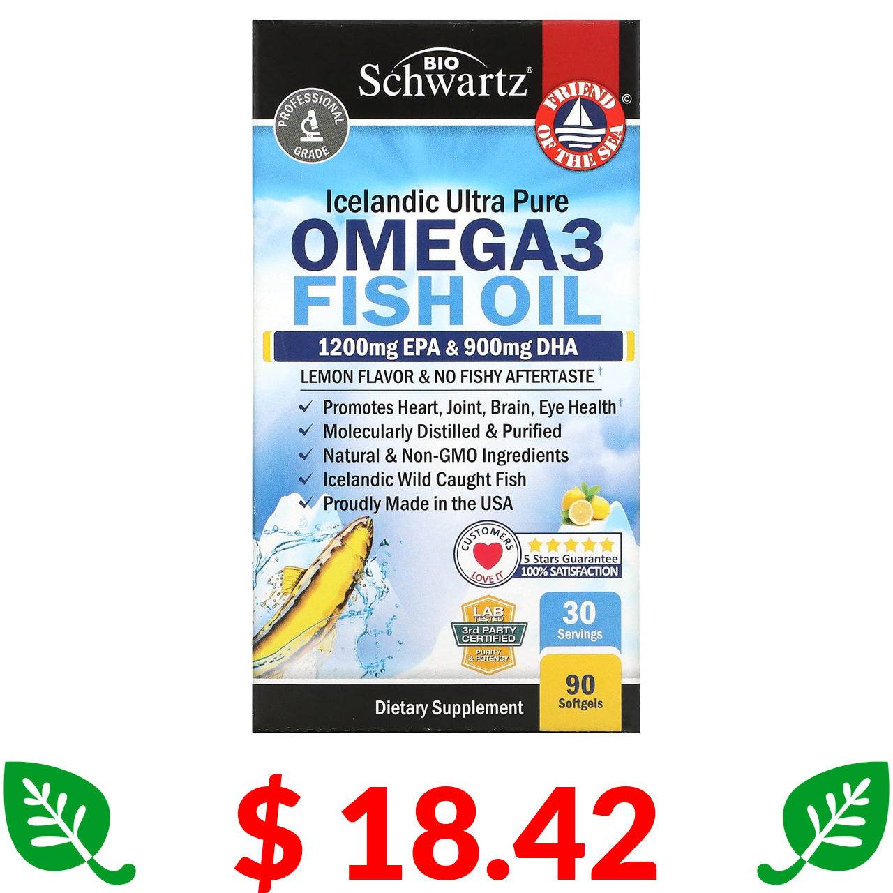 $ 18.42 BioSchwartz, риб’ячий жир з омега-3, зі смаком лимону, 1200 мг ЕПК, 900 мг ДГК, 90 капсул