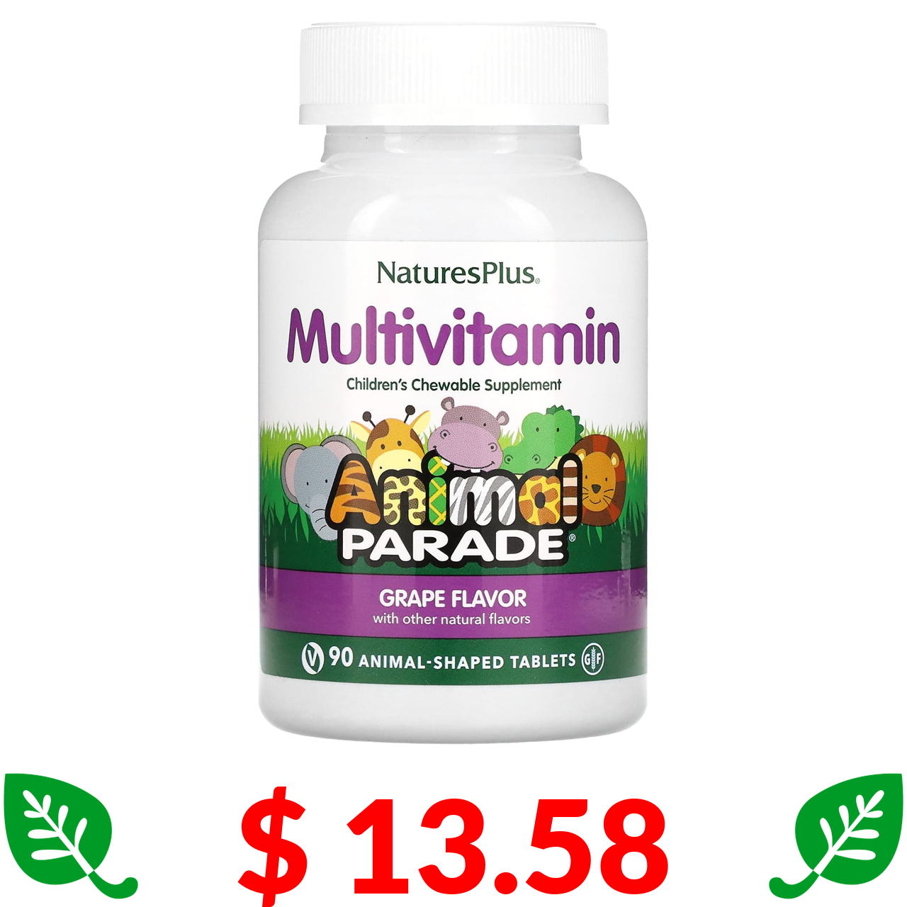$ 13.58 Натурес Плюс, Source of Life, Animal Parade, жевательные мультивитамины с микроэлементами для детей, со вкусом винограда, 90 таблеток в форме животных