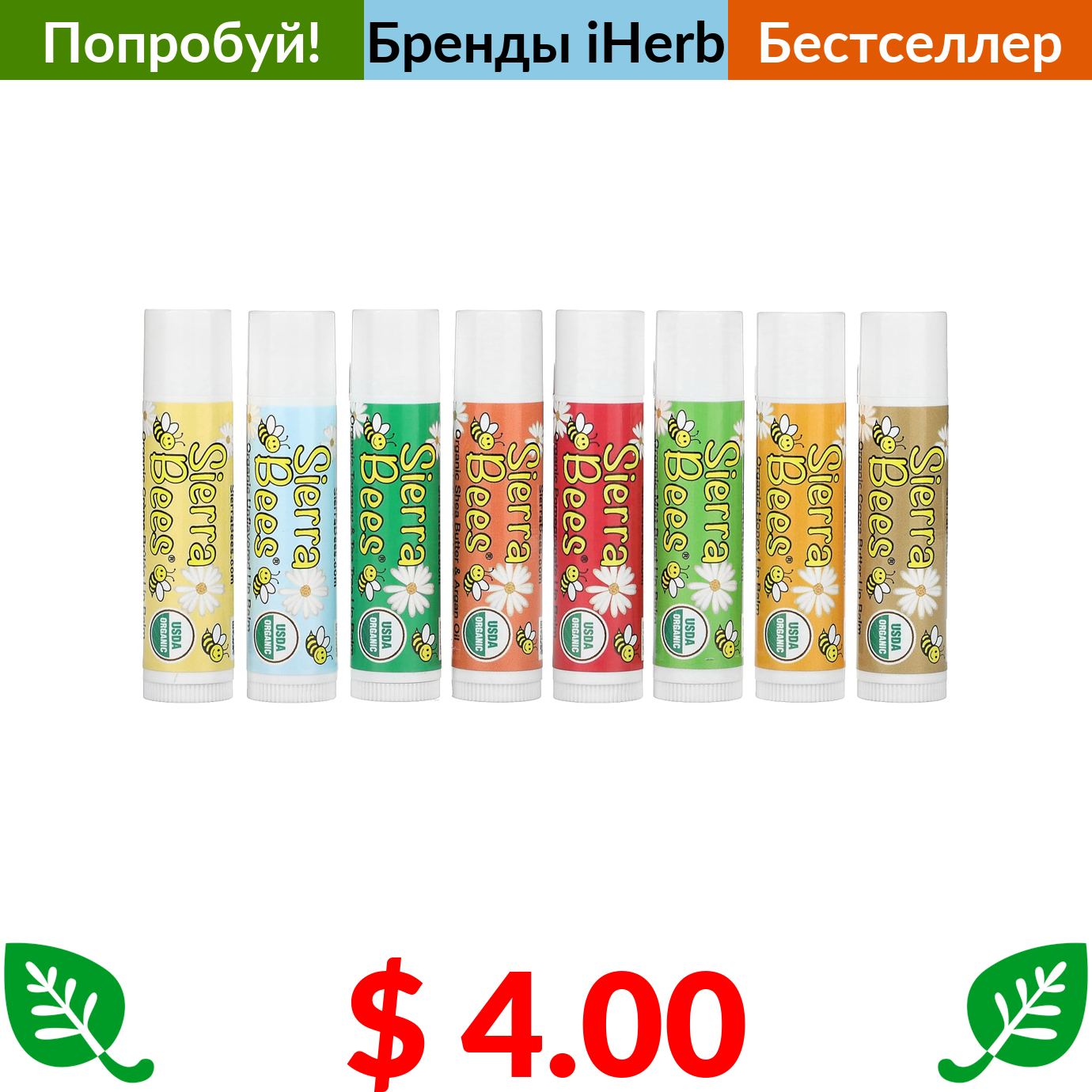 $ 4.00 Sierra Bees, набор органических бальзамов для губ, 8 в упаковке, 4,25 г (15 унций) каждый