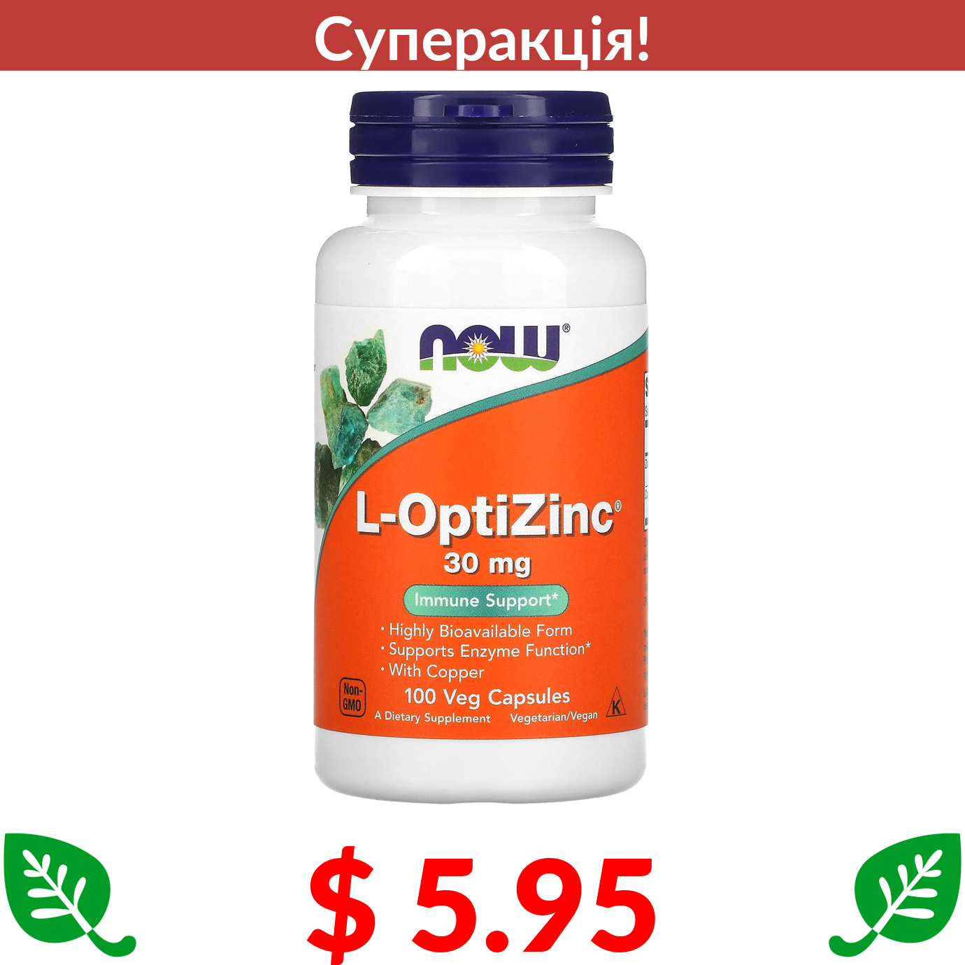 $ 5.95 Now Foods, L-OptiZinc, добавка з цинком, 30 мг, 100 веганських капсул