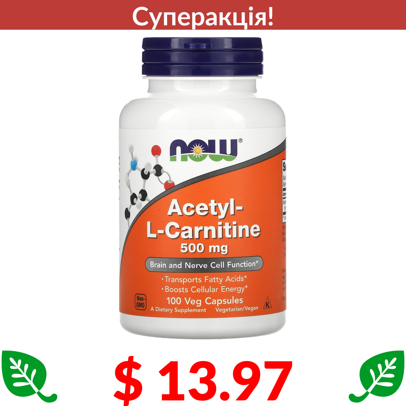 $ 13.97 Now Foods, ацетил-L-карнітин, 500 мг, 100 вегетаріанських капсул