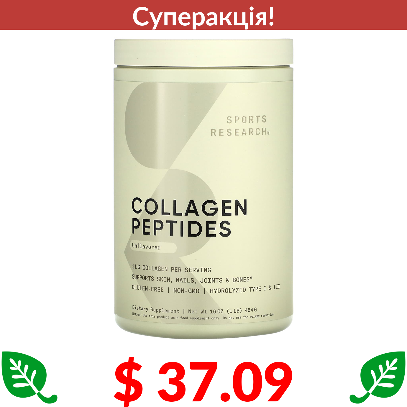 $ 37.09 Sports Research, пептиди колагену, з нейтральним смаком, 454 г (16 унцій)