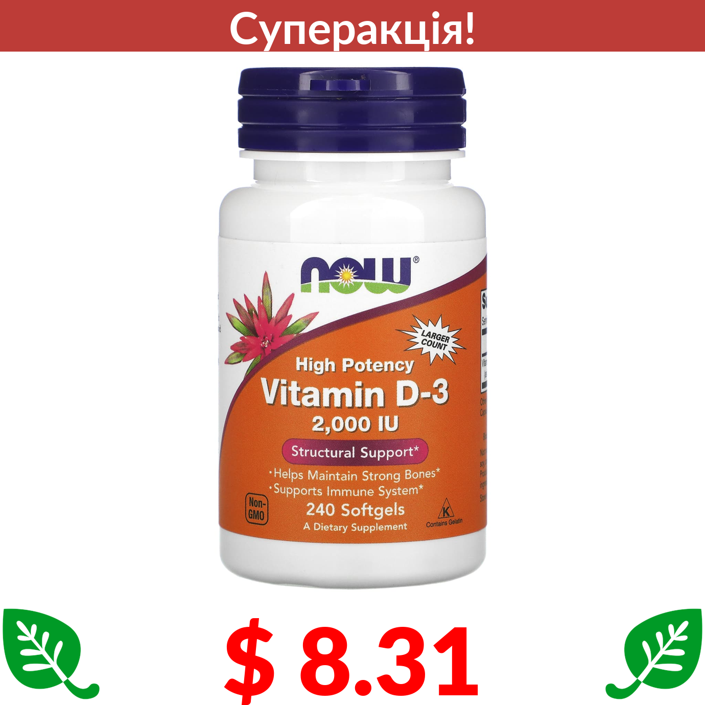 $ 8.31 Now Foods, високоефективний вітамін D3, 50 мкг (2000 МО), 240 м’яких таблеток