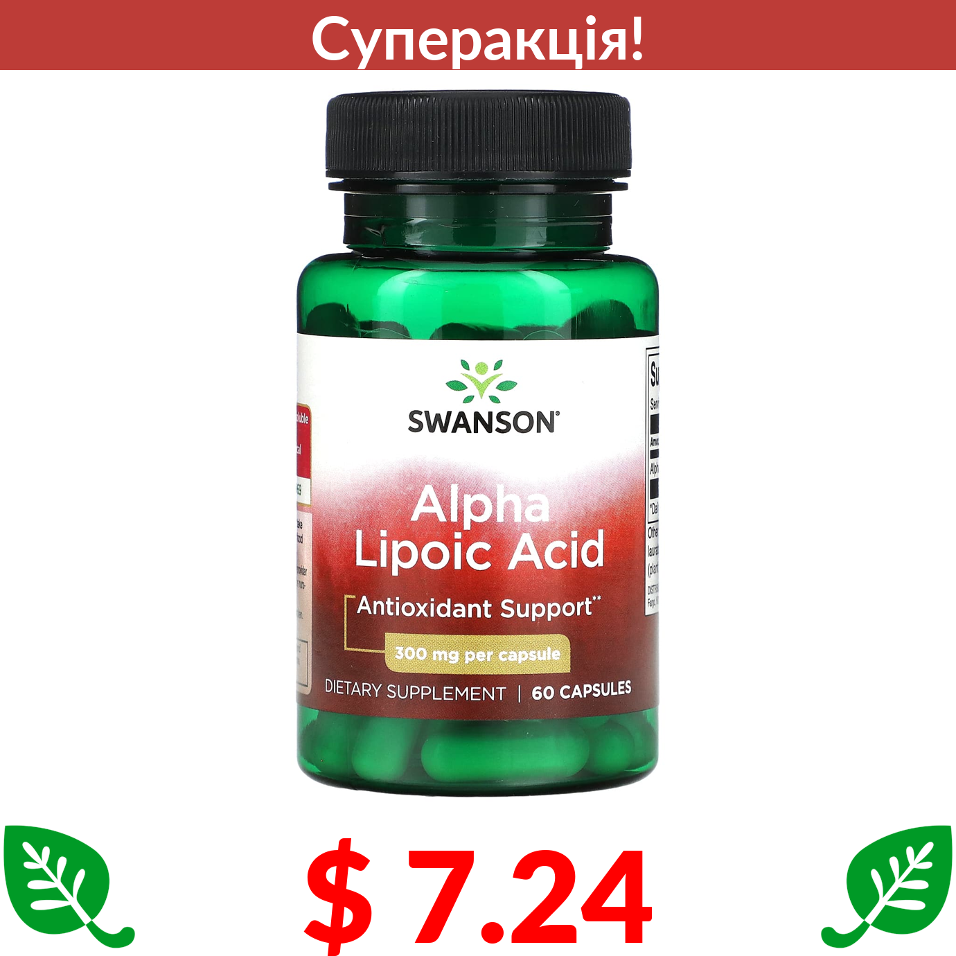 $ 7.24 Swanson, альфа-ліпоєва кислота, 300 мг, 60 капсул
