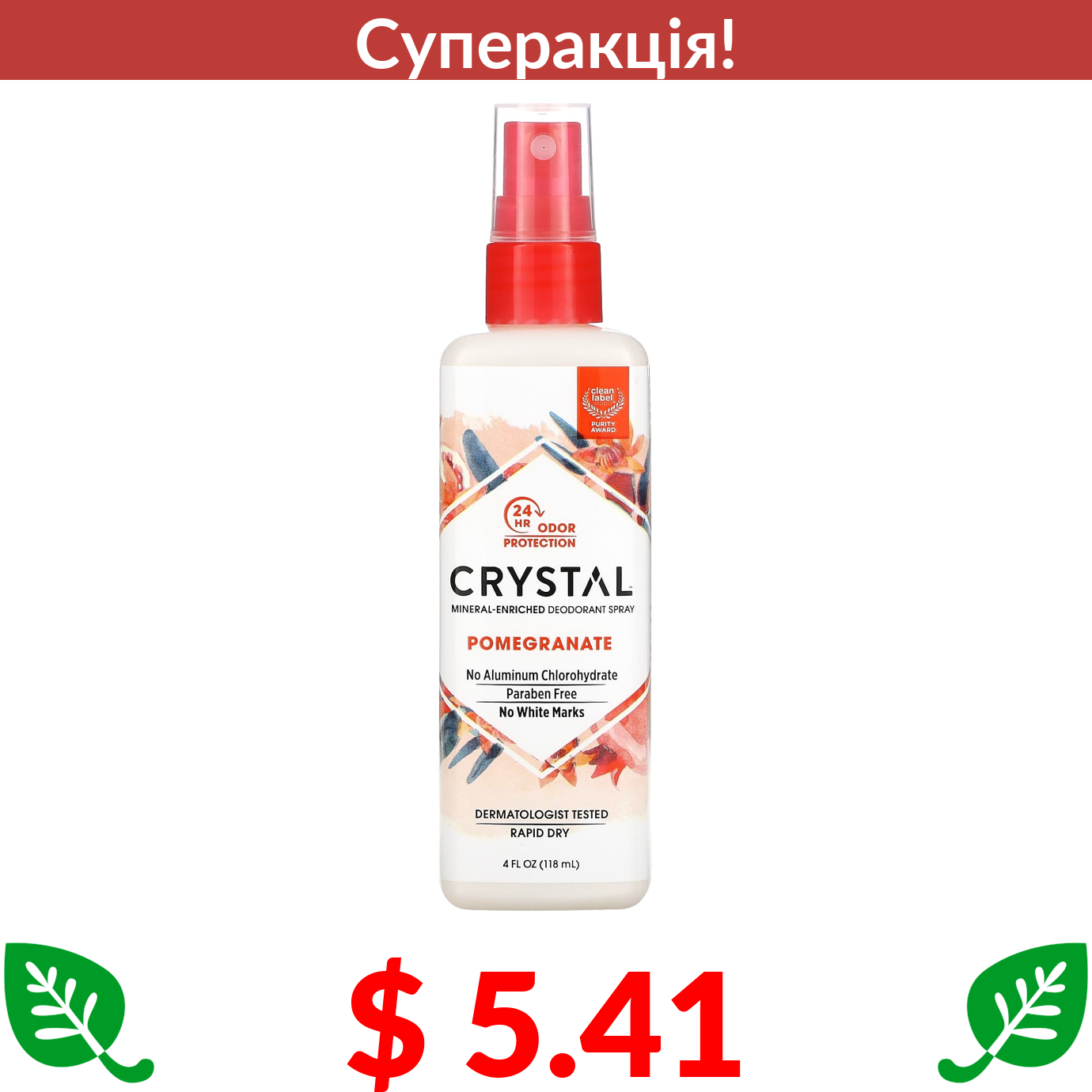 $ 5.41 Crystal Body Deodorant, мінеральний спрей-дезодорант, гранат, 118 мл (4 рідк. унції)