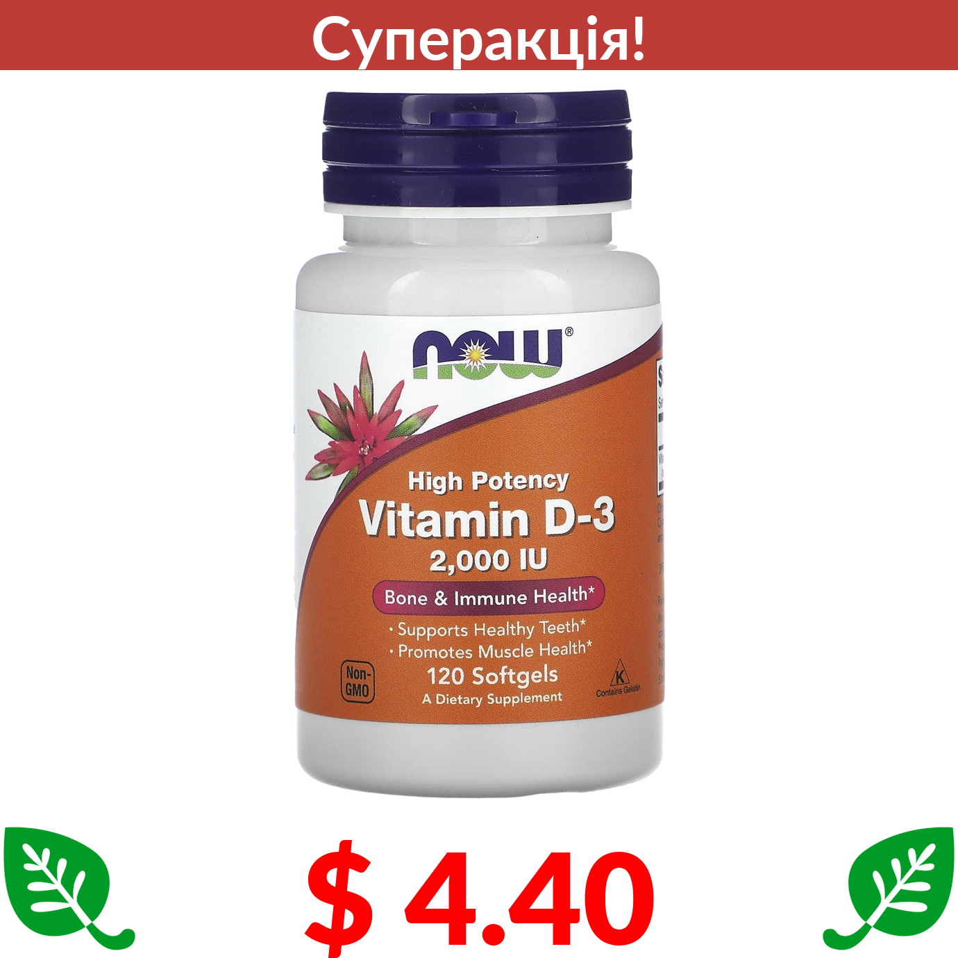 $ 4.40 Now Foods, високоефективний вітамін D3, 50 мкг (2000 МО), 120 капсул
