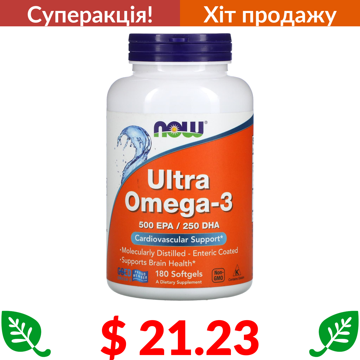 $ 21.23 Now Foods, Ultra Omega-3, 500 ЕПК / 250 ДГК, 180 капсул, вкритих кишковорозчинною оболонкою