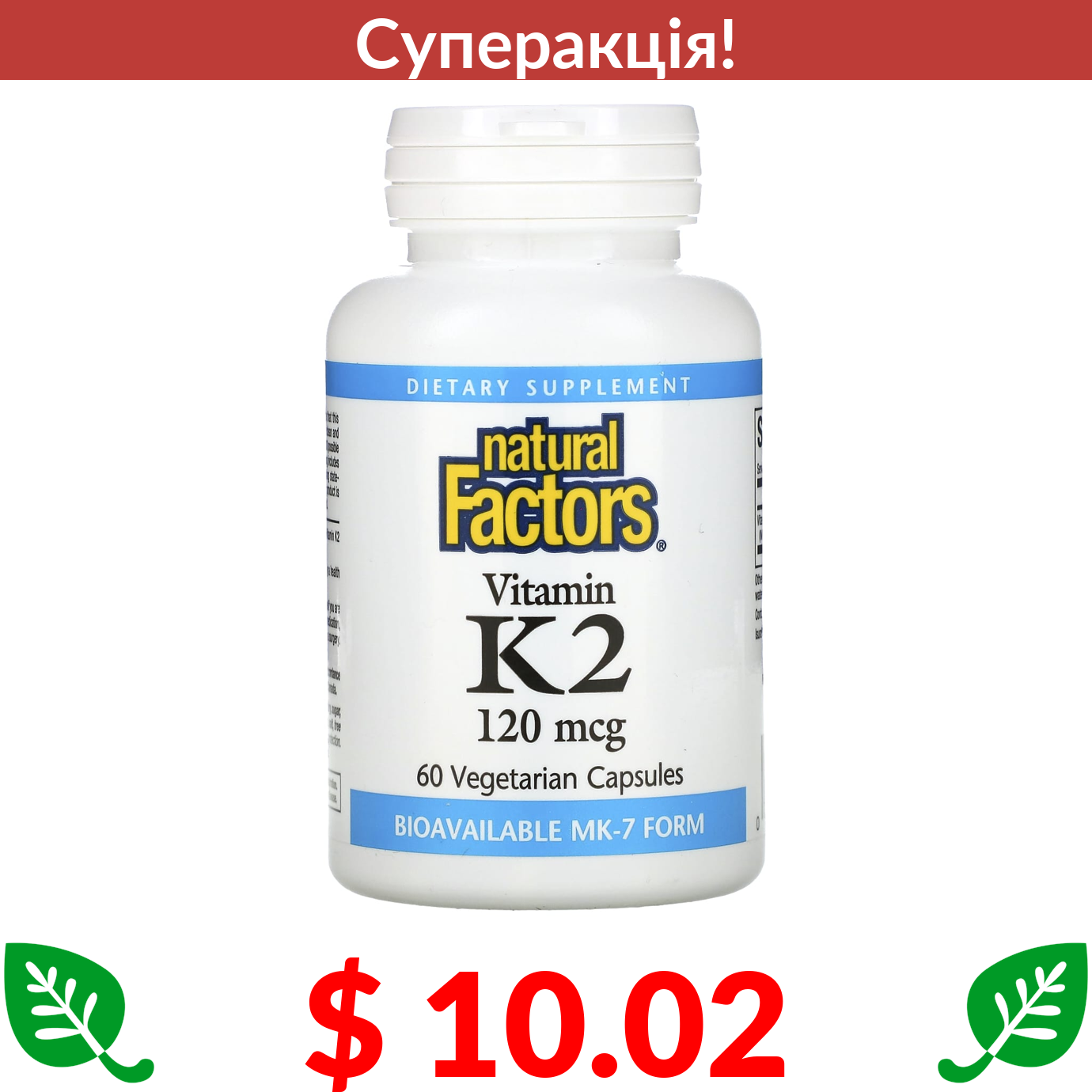 $ 10.02 Natural Factors, вітамін К2, 100 мкг, 60 вегетаріанських капсул