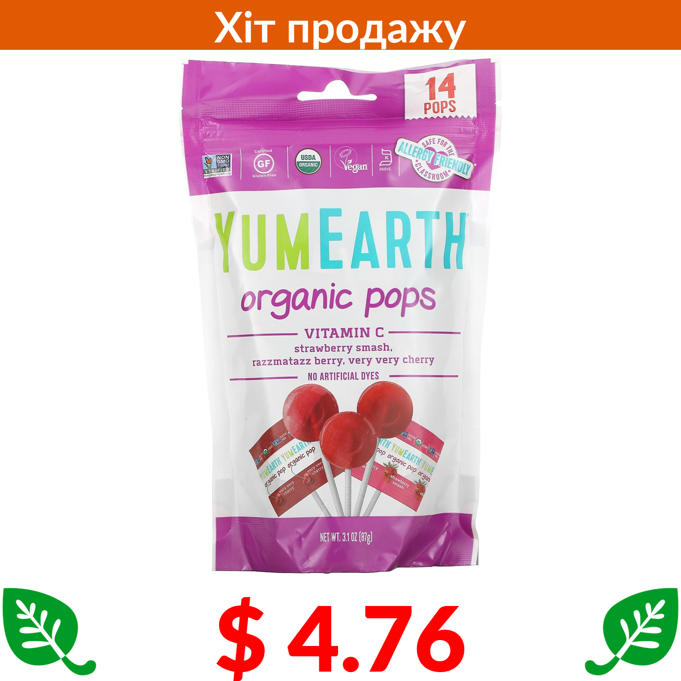 $ 14.51 YumEarth, органічні льодяники, асорті, 50 шт., 310 г (10,9 унції)