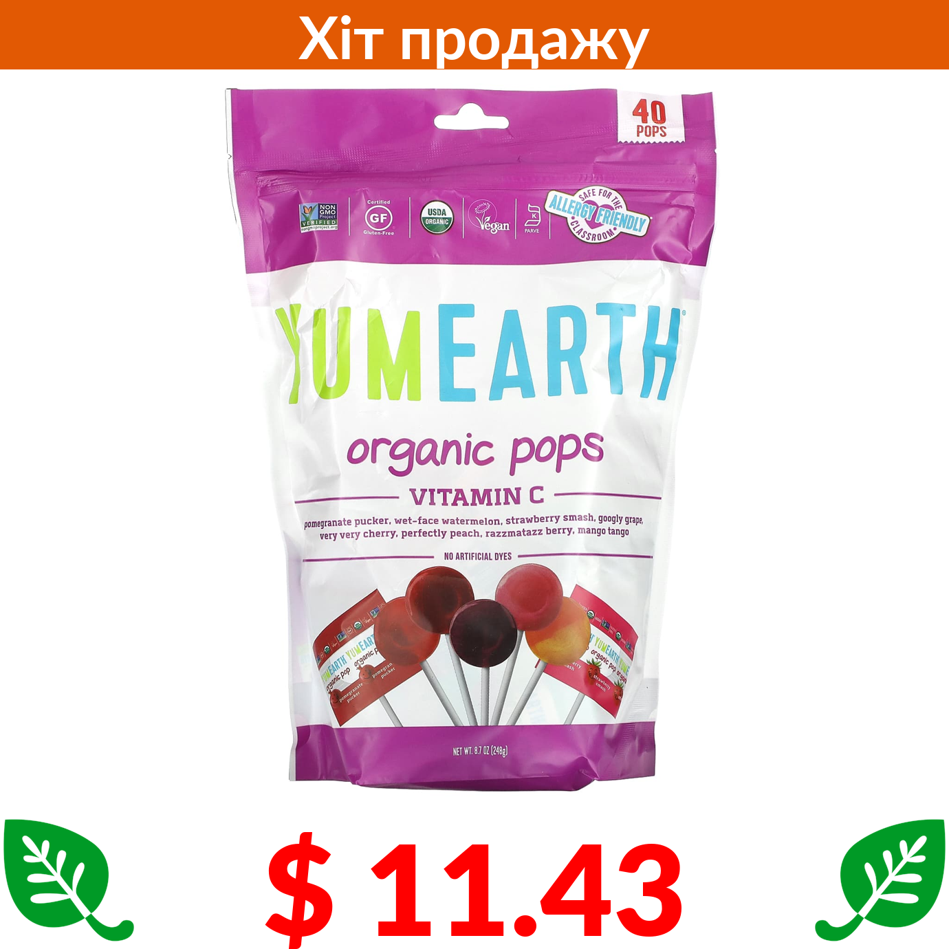 $ 11.43 YumEarth, органічні льодяники, з вітаміном С, асорті, 40 льодяників, 241 г (8,5 унції)