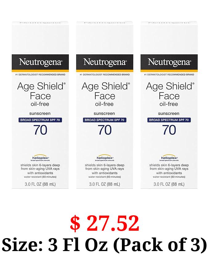 $ 27.52 Size: 3 Fl Oz (Pack of 3) Neutrogena Age Shield Face Oil-Free Sunscreen Lotion with Broad Spectrum SPF 70, Non-Comedogenic Moisturizing Sunscreen to Help Prevent Signs of Aging, PABA-Free, 3 fl. oz (Pack of 3)