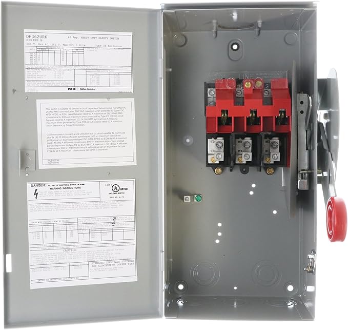 Category: Power Distribution Safety Switches / Disconnects Heavy Duty - Non-Fused Heavy Duty - Non-Fused - 600 Volt - 3 Pole Products related to DH363URK Safety Switch, 100A, 3P, 600VAC/250VDC, DH, Non-Fusible, NEMA 3R or visit the Eaton site .; For help with Safety Switch, 100A, 3P, 600VAC/250VDC, DH, Non-Fusible, NEMA 3R from Eaton; Click "Add to Cart" to buy Eaton DH363URK Safety Switch . . .