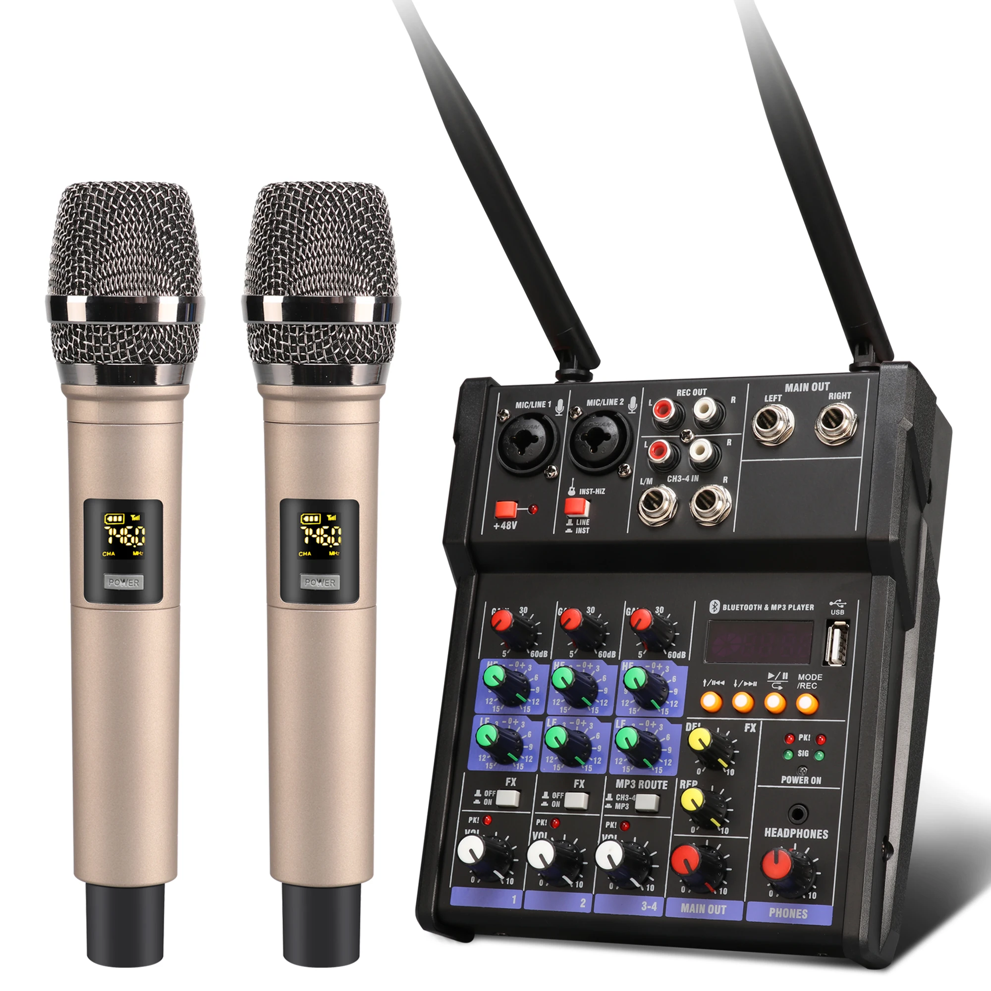 RsqziqGDVДолго искали 4 Channel Audio Mixer Console with Wireless Microphone Mini DJ Bluetooth Mixer with 48V Phantom Power R20, но не могли найти? Предоставляем вашему вниманию 4 Channel Audio Mixer Console with Wireless Microphone Mini DJ Bluetooth Mixer with 48V Phantom Power R20 по лучшей цене на рынке!