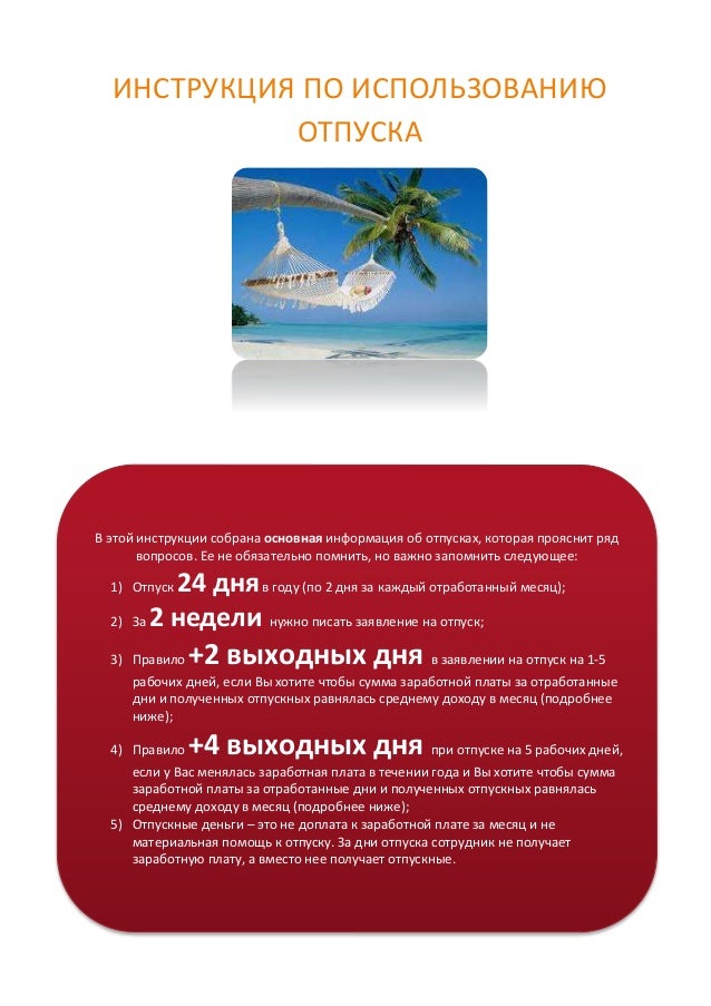 Отпуск это любимое слово каждого рабочего . По статистике каждый ждет с нетерпеньем отпуска уже после завершения очередного . Кроме того, ожидания отпуска помогает каждому лучше работать .