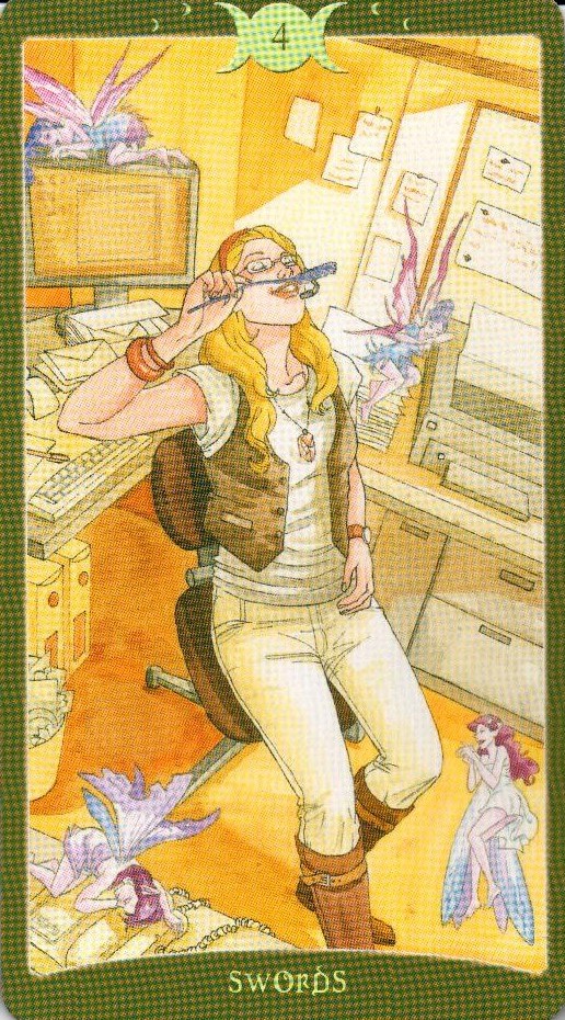 Четверка Мечей - карта покоя и отрешенности, она абсолютно исключает суету . Ее главные значения - уединение и изоляция, изгнание и отступление, отсрочка и временный уход . В делах . . .