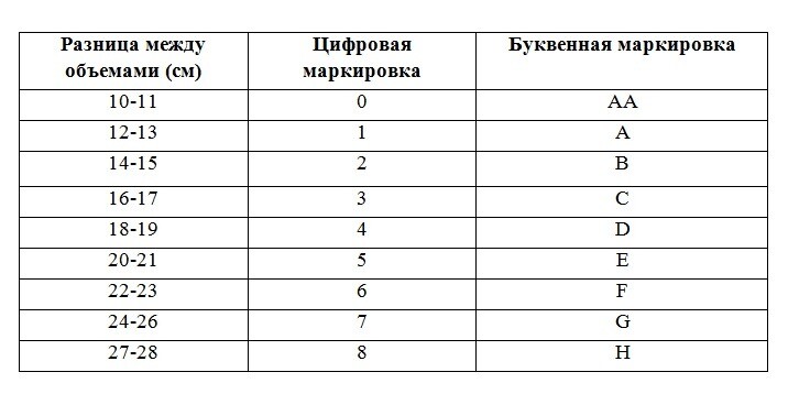 12-13 см — первый размер бюста; 14 -15 см — 2-й; 16-17 — 3-й; 18-19 — 4 -й . Дальше классификация складывается по аналогии . Каждые 2 см отвечают следующему номеру бюста .