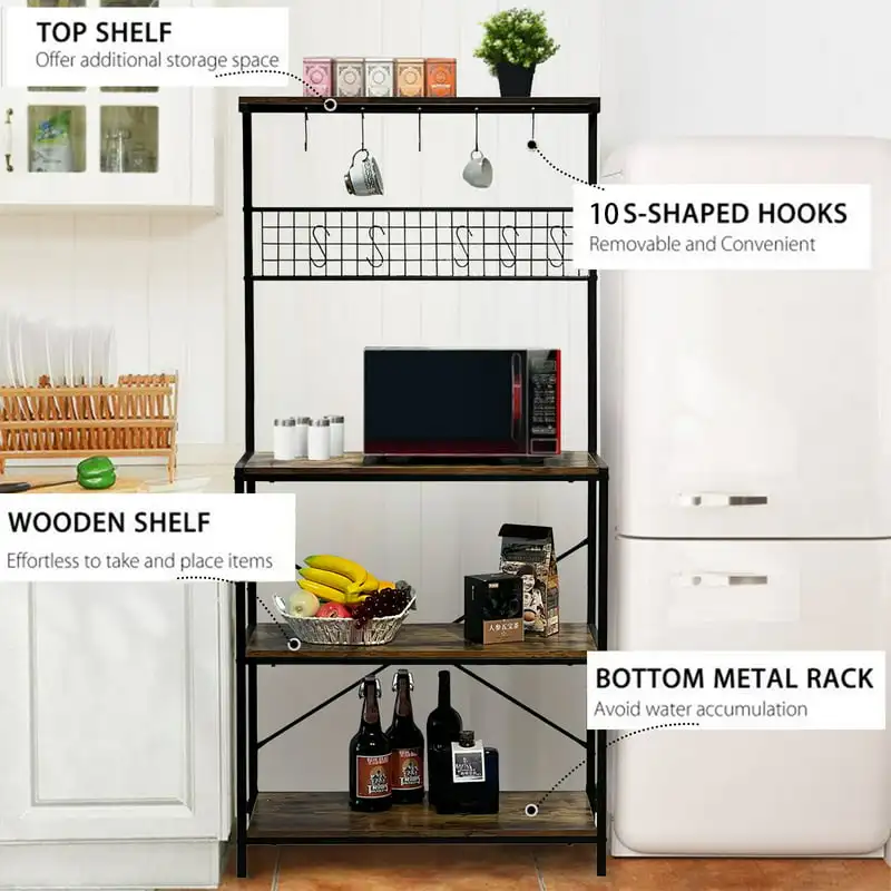 "4 Tier Baker's Rack for Kitchens Rack Storage Shelf Cart with Hanging Hooks Brown" * Buy Now With Free Shipping Just For $68