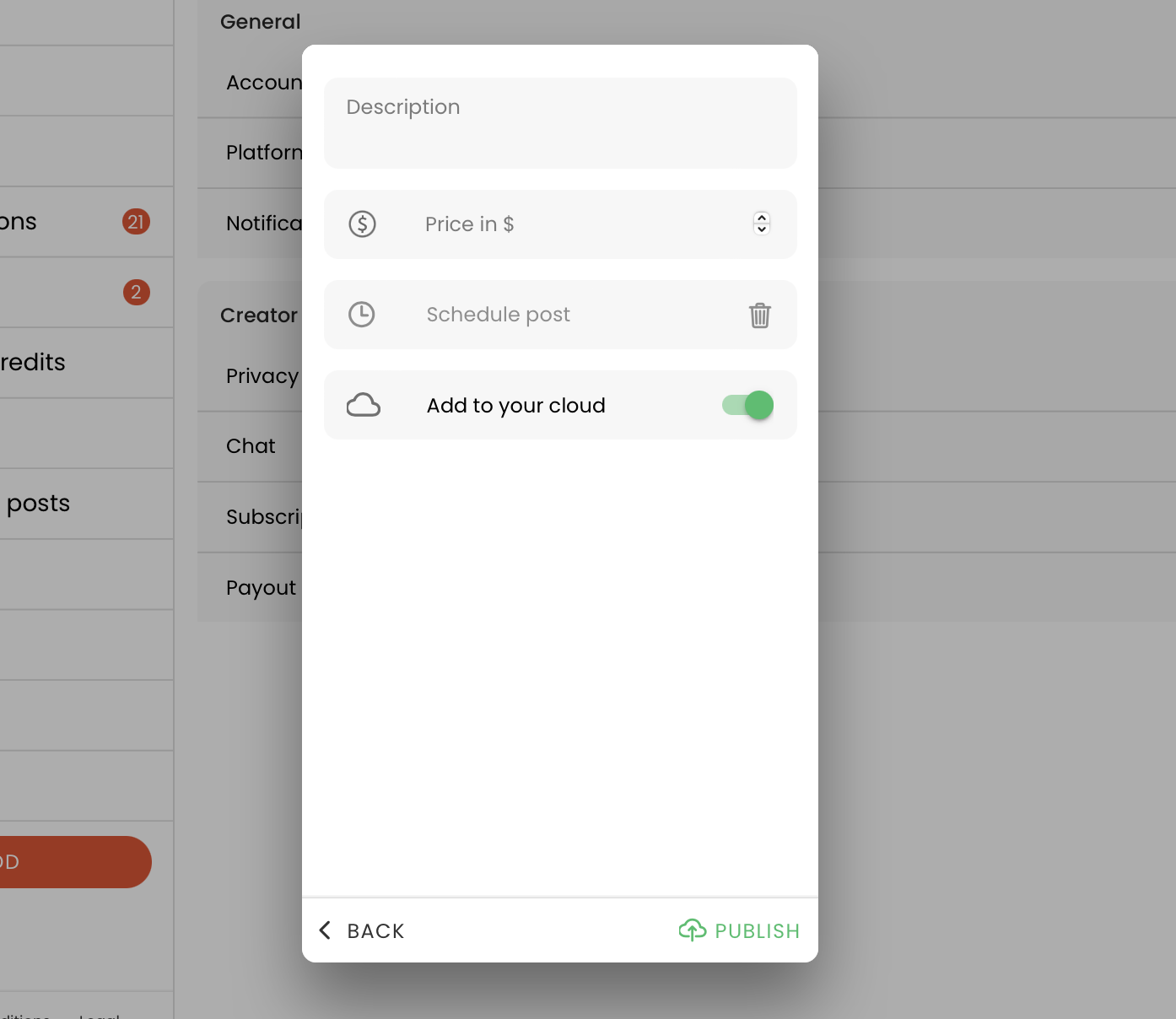 Теперь выбираем как и откуда будем грузить контент, подбираем превью и заполняем: Description, Price на одноразовую покупку, задаем расписание и публикуем.