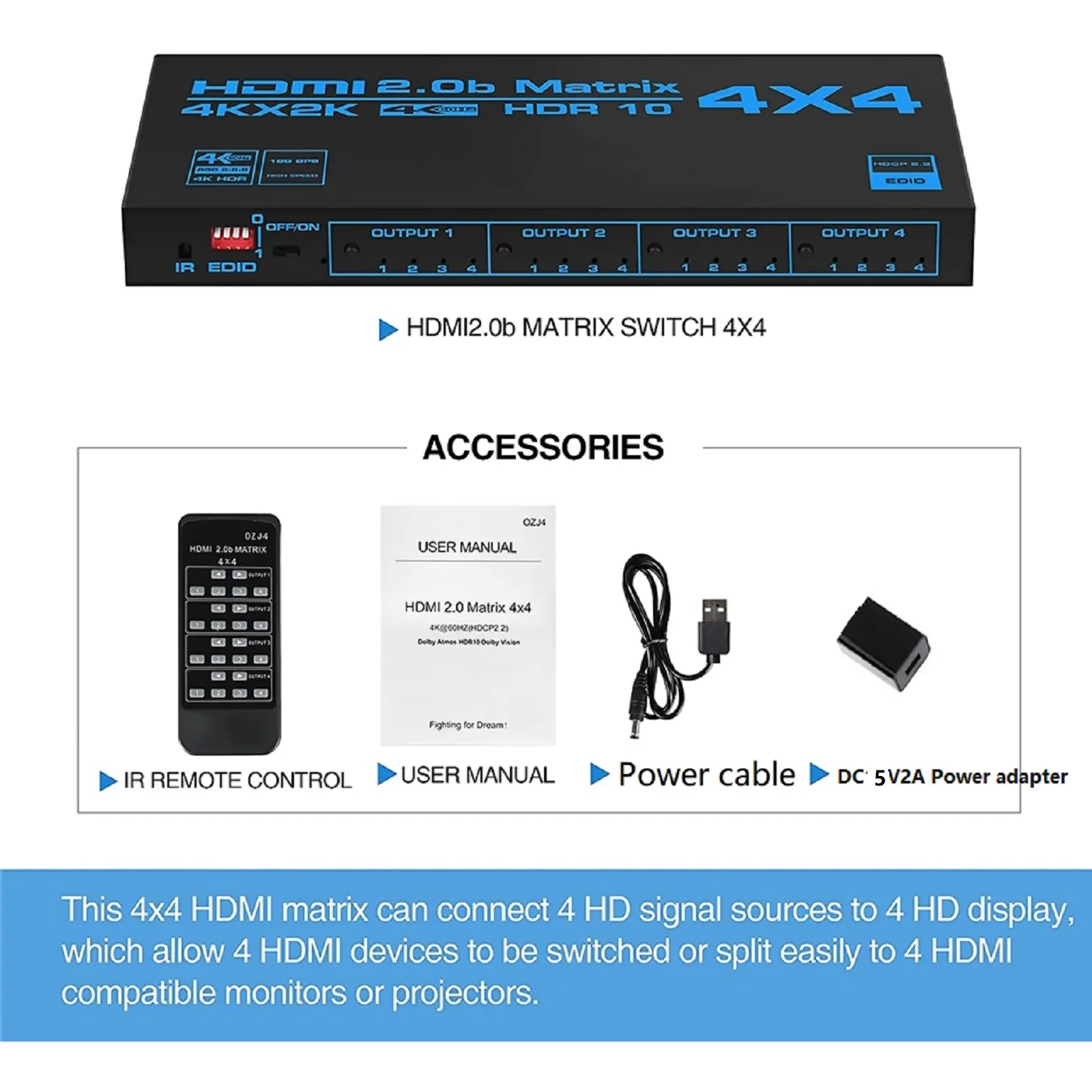 vqnvcLKqPAHere you can buy 4K HDR 4x4 HDMI-compatible 2.0 Matrix Switch HDCP 2.2 Switcher Splitter 4 In 4 Out Box with EDID Extractor & IR Remote Control with free delivery to your post office.
