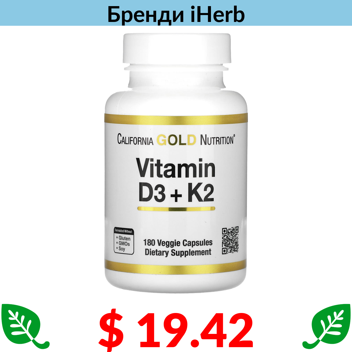 $ 19.42 California Gold Nutrition, вітаміни D3 й K2, 180 рослинних капсул