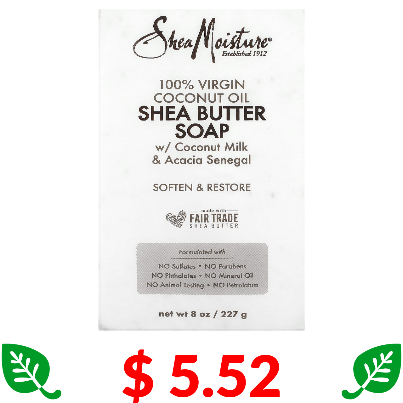 $ 5.52 SheaMoisture, мило зі 100 % кокосовою олією першого віджиму та маслом ши, 227 г (8 унцій)