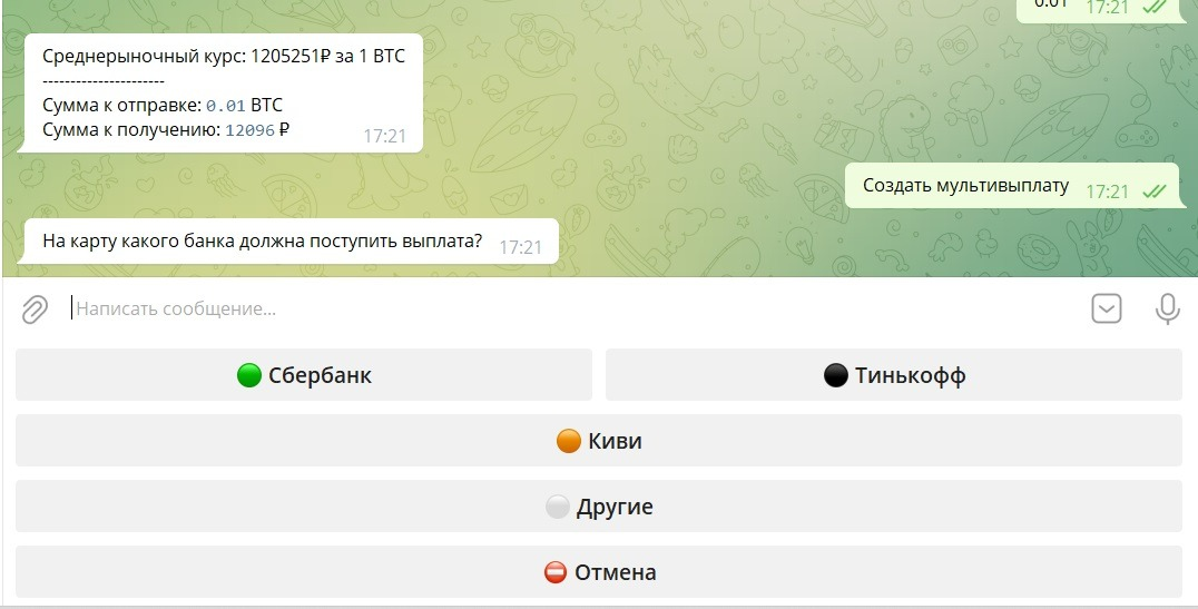 Далее бот предлагает создать заявку. Есть возможность СОЗДАТЬ ВЫПЛАТУ и СОЗДАТЬ МУЛЬТИВЫПЛАТУ.