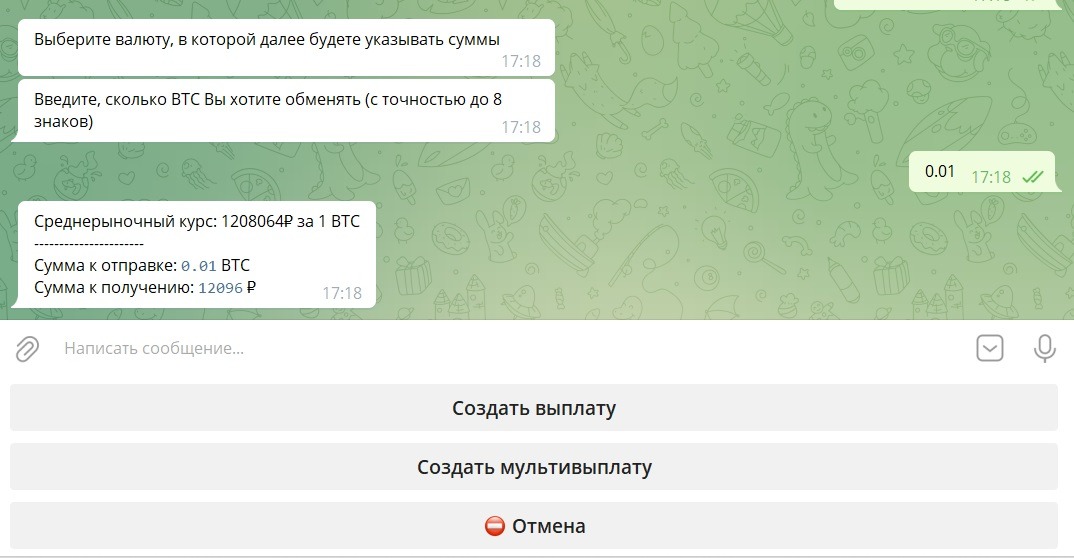 Далее есть возможность указать сумму в БТС, которую отправите, и бот посчитает сколько рублей придет на карту. Либо указать желаемую сумму поступления в рублях, и бот подсчитает количество БТС которое необходимо отправить.