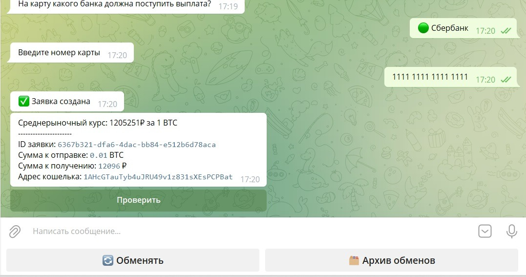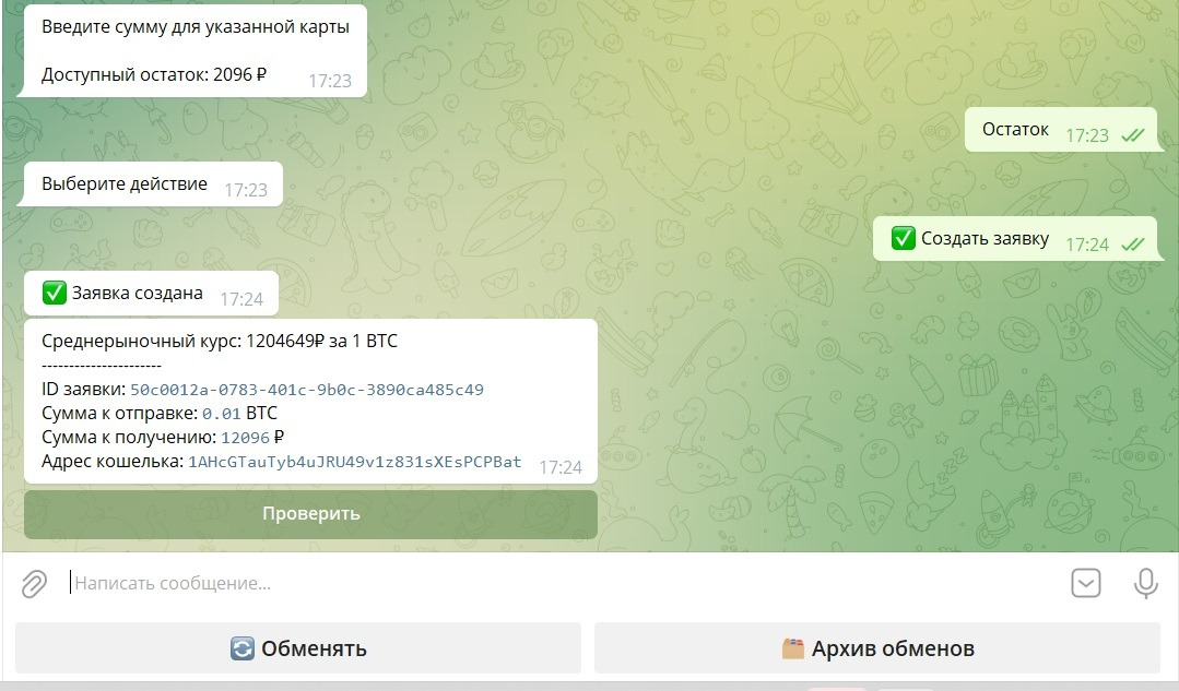 После ввода всех данных заявка будет создана. Теперь необходимо сделать перевод нужной суммы на адрес кошелька, который выдал бот, и после 1-го подтверждения в сети блокчейна нажать ПРОВЕРИТЬ. Заявка будет создана и оператор осуществит выплату в кратчайшие сроки!