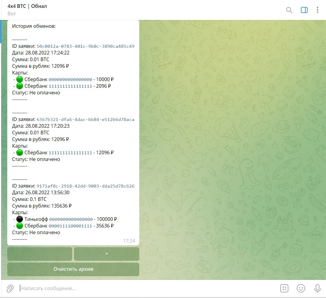 Так же в боте есть АРХИВ где отображаются все заявки пользователя с подробными данными и статусом заявки: