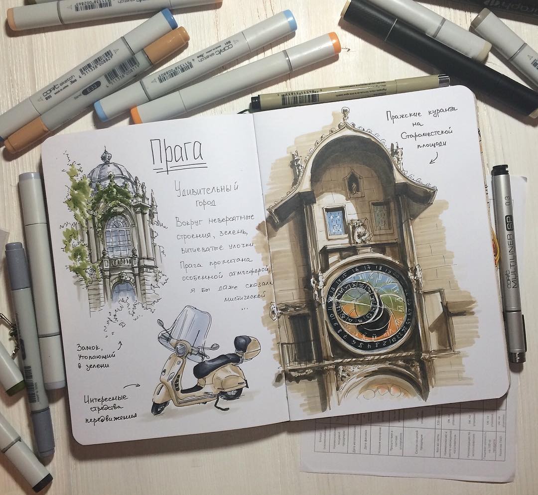 Суть скетчей в скорости, их рисуют независимо от места, инструмента или бумаги. Но есть и визитная карточка. Слышите скетч? Представляете маркеры! Топчик — Copic, Stylefile marker, Chartpak, Promarker, TOUCH, ZIG. Но не маркерами едиными. Классика — акварель, тушь, цветные и акварельные карандаши, уголь, цветные чернила, пастель. Идеальным альбомом для зарисовок станет скетчбук для маркеров. Но для начала подойдет любой блокнот или вырванный из тетради лист.