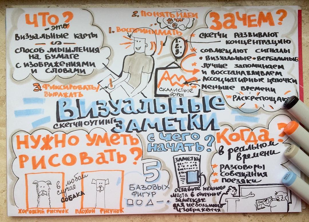 Скетчноутинг (Sketchnouting) — фиксация идей или мыслей на бумаге с помощью зарисовок и слов. Простая формула: скетч + текст = скетчноутинг.