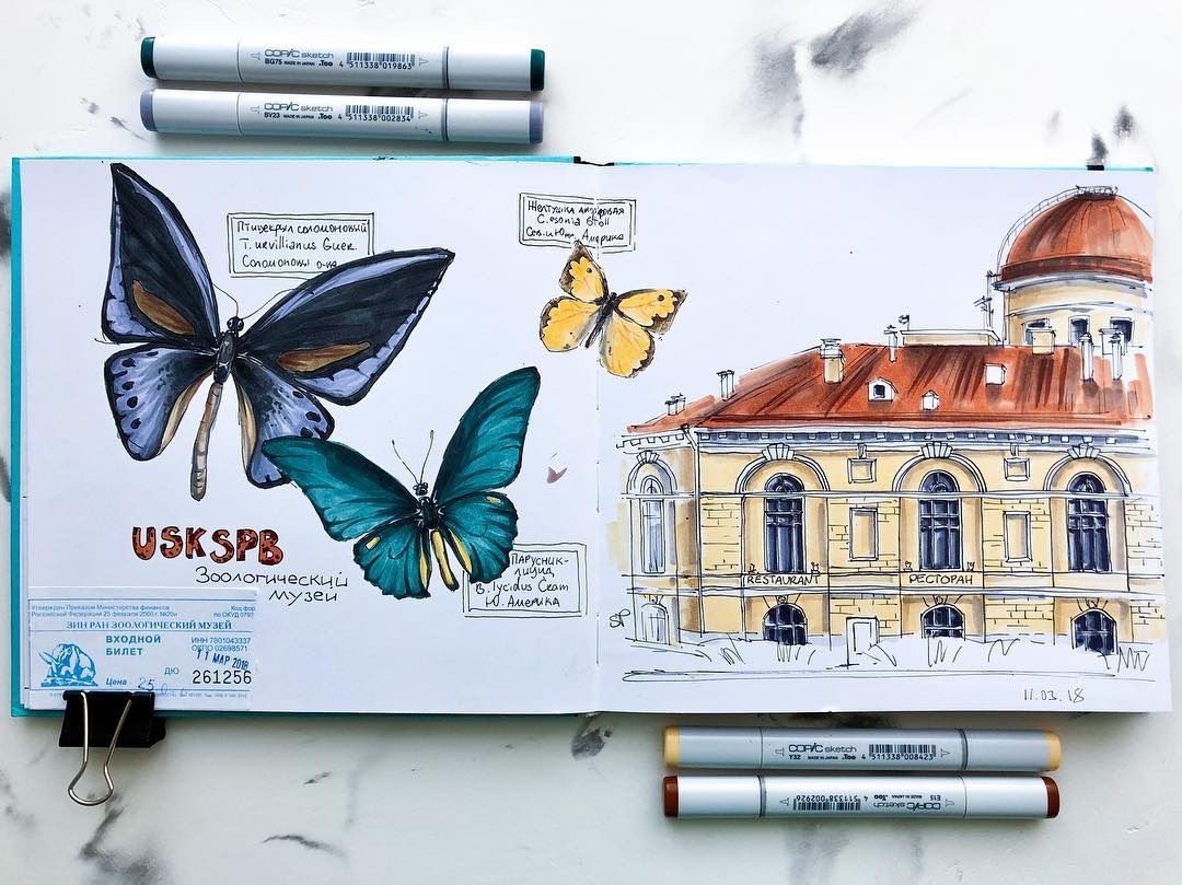 По аналогии с папой скетчем — в любом месте, маркерами в скетчбуке.