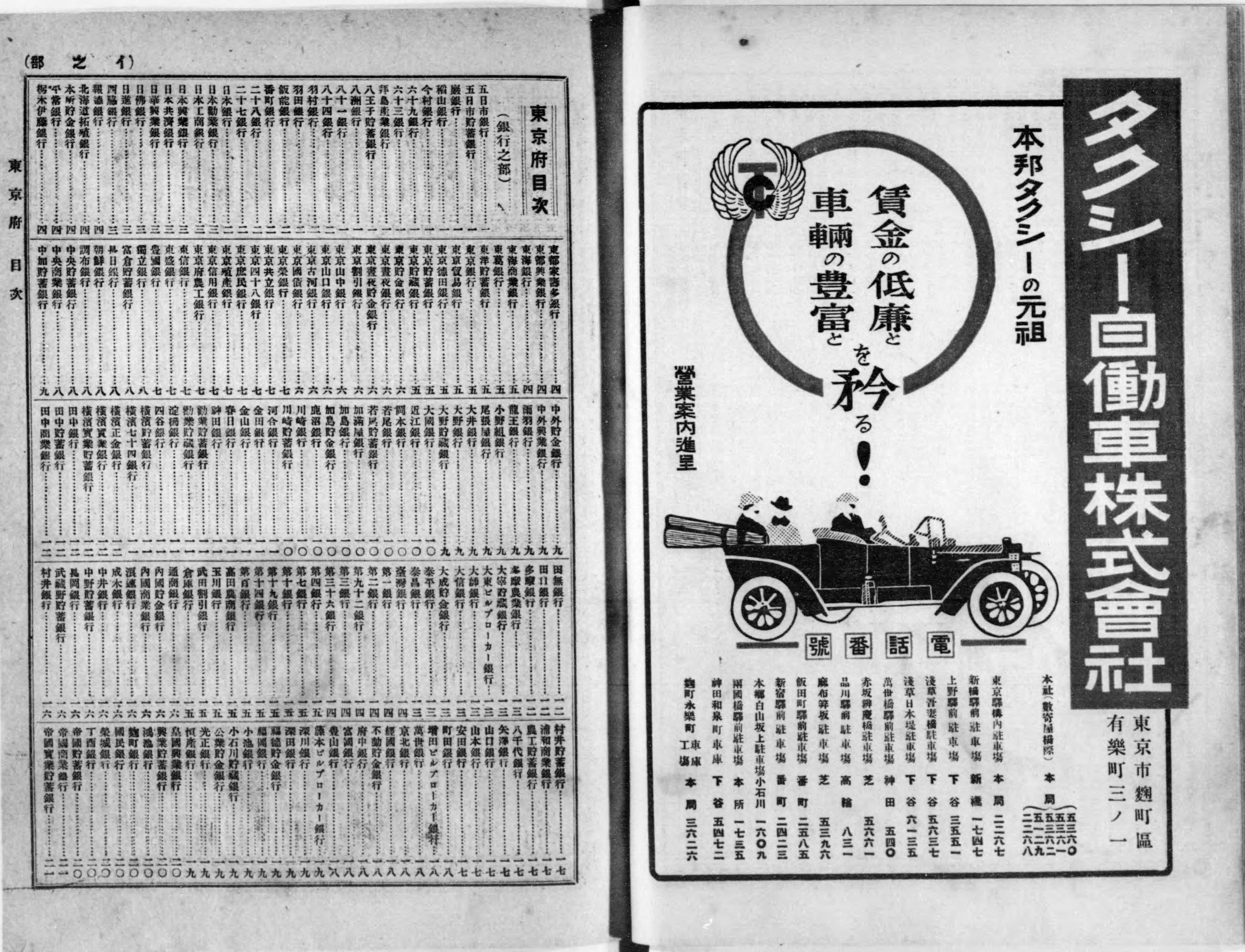 В токийском квартале Юракутё открылась первая служба японского такси. Пассажирскими перевозками занималась фирма «Такуси дзидося» (яп. такуси дзидося кабусикигайсяタクシー自働車株式会社, русскоязычный эквивалент – «АО Автотакси»), учреждённая месяцем ранее. Её отцом-основателем и директором был бизнесмен с китайскими корнями по имени Тё Харуто 長晴登, уроженец города Нанъё префектуры Ямагата. Он собирался стать школьным учителем, но решил заняться политикой и предпринимательством. Помимо такси, ему принадлежала и первая в Японии фирма по осуществлению автомобильных прогулок и экскурсий, основанная в том же 1912 году. Согласно справочнику японских компаний за 1913 год, помимо Тё Харуто, в «Такуси дзидося» трудились ещё 12 человек, акционный капитал фирмы на тот момент составлял 500 тысяч йен, номинал одной акции равнялся 50 йенам. Связаться с «Такуси дзидося» можно было по двум телефонным номерам – 4295 и 2268. Автомобильный парк первой службы такси был представлен шестью «Фордами» модели «Т», оснащенными таксометрами. В настоящее время 5 августа, день, когда фирма «Такуси дзидося» начала принимать заказы, считается в Японии «днём такси». Этот профессиональный праздник был учрежден в 1984 году. Начиная с 1989 года, в этот день ассоциация таксистов Японии устраивает различные мероприятия, связанные с популяризацией такси, а также проводит встречи водителей, на которых обсуждаются актуальные проблемы перевозок, вроде обустройства парковочных мест, прохождения медицинского осмотра и делового этикета.