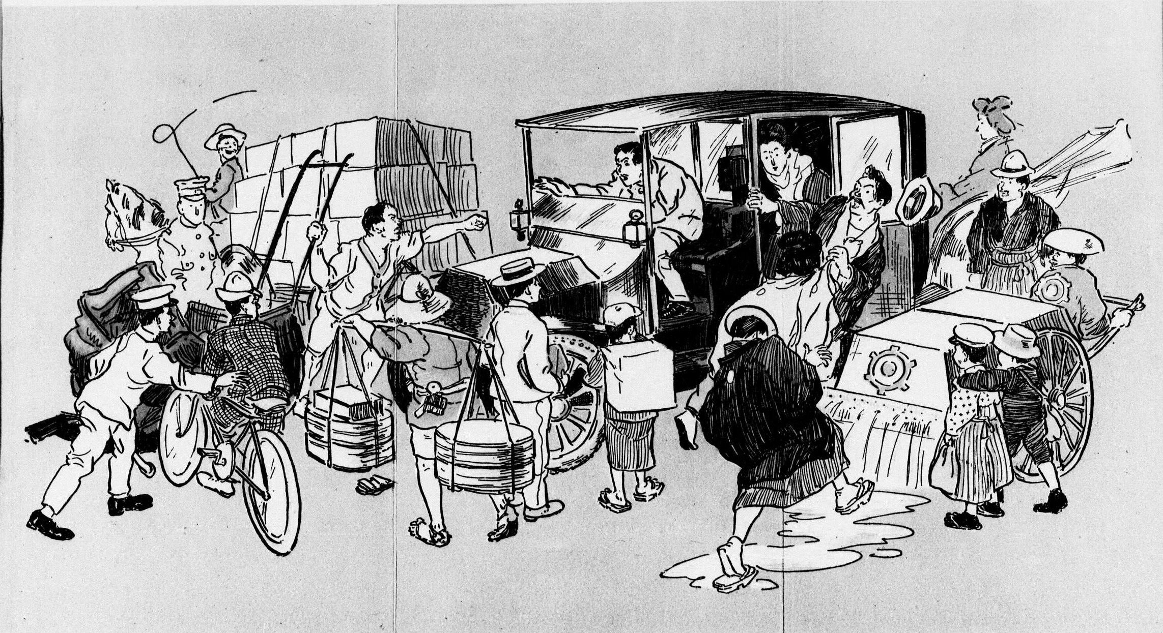 К середине 30-х годов взрослого японца, тем более обитателя крупного города, уже было не удивить наличием такси, но когда фирма «Такуси дзидося» только начала свою работу, многие испытывали от автомобильных поездок сильные эмоции разнообразного плана, от детского восторга до неподдельного ужаса перед ошеломительной скоростью четырёхколёсного транспорта. В 1913 году в издательстве «Хэйандо» вышла книга «Рассказы о такси» タキシ物語 (яп. такиси моногатари) писателя и сценариста Отиаи Намио 落合浪雄, в которой было собрано 16 небольших произведений, так или иначе связанных с такси и автомобилями вообще. Рассказы написаны в комичной манере и не лишены интересных наблюдений за поведением японцев, столкнувшихся с этим чудом технического прогресса. Общий тон повествованию задаёт предисловие: «Говорят, что узнать, насколько та или иная местность богата или бедна, можно по количеству автомобилей в ней. В сегодняшнем Токио их пятьсот. Каждый из них перевозит в день примерно по десять пассажиров. Получается, что за один месяц на автомобилях ездит 150 тысяч человек. Если каждый из них будет так добр, что купит эту книгу, то её скромный автор сможет позволить приобрести и автомобиль и себе». Уже в первом рассказе Отиаи заявляет, что в Токио можно встретить любое такси, какое только захочется – дорогое и необычайно дешевое, с опознавательными знаками и без, хотя не прошло и года с момента начала его работы, однако далеко не все успели к нему привыкнуть. С одним из героев рассказа «Сопровождающий» 御供 (яп. отомо), например, чуть не случился сердечный приступ, когда он сел в такси, и машина резко ускорилась: «Автомобиль так быстро набрал скорость, что в груди всё защемило, ноги онемеле, а сердце бешено заколотилось». Если предположить, что этим автомобилем была «Жестяная Лиззи», она же Ford Model T, то, согласно характеристикам, его максимальная скорость не превышала 70 – 72 километров в час, и подобной быстроходностью сейчас, наверно, вряд ли кого-нибудь можно впечатлить.