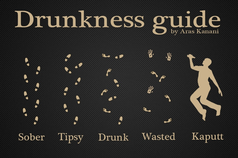 Шуточная инфографика от Aras Kanani — помогает определить степень подпития человека по следам на снегу: