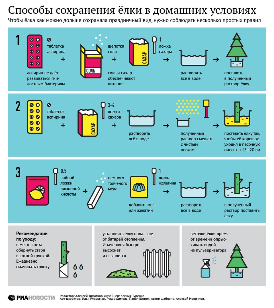 Инфографика от старой команды «РИА Новостей», сделанная в период арт-директорства Ильи Рудермана. Эта картинка не про данные — здесь перед нами инфографика-инструкция. Несколько простых шагов, которые позволят вам сохранить елку свежей если не до майских праздников, то хотя бы до старого Нового года.