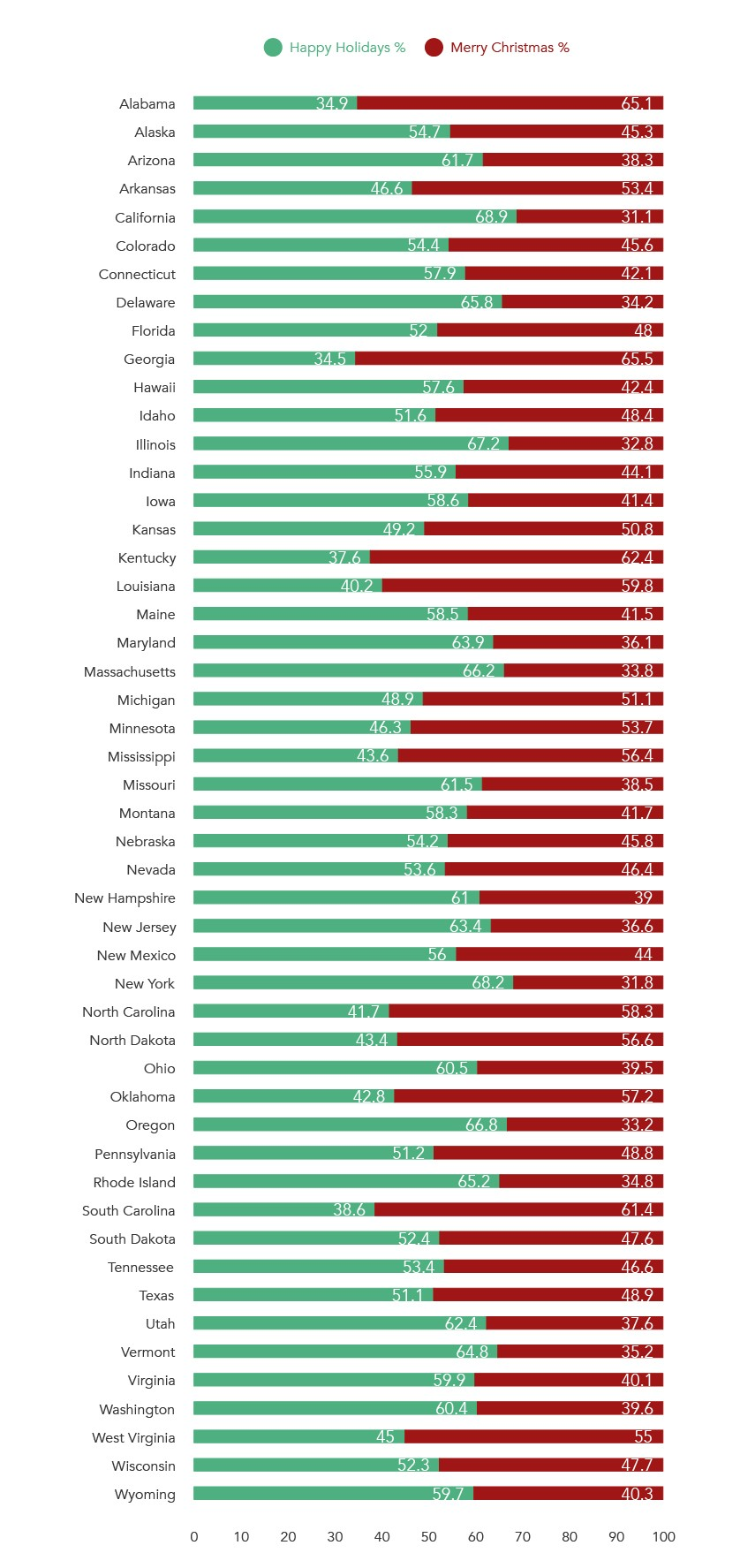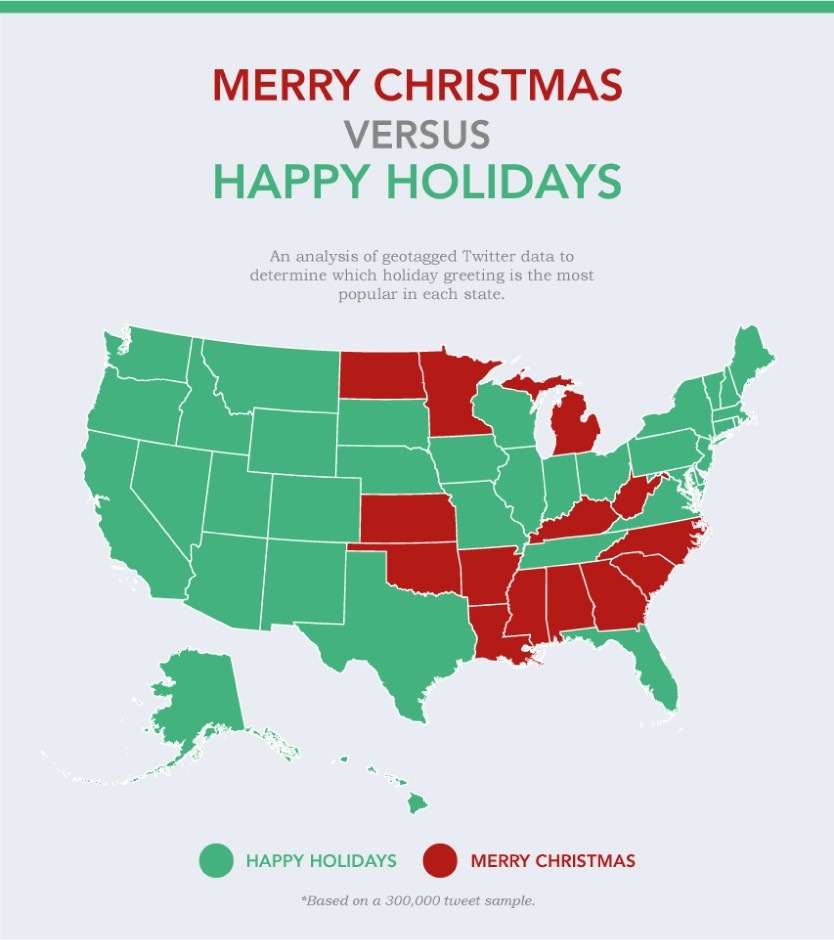 Больше всего «Merry Christmas» — в консервативных Джорджии и Алабаме, чемпион по «Happy Holidays» — сверхлиберальная Калифорния: