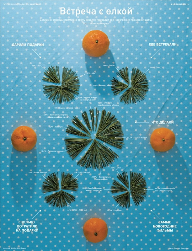 Инфографика 2013 года от журнала (тадам!) «Инфографика». Здесь информационный дизайн явно принесен в жертву новогодней атмосфере. Но не будем слишком строги — ведь круговые диаграммы из хвои правда милые. Даже несмотря на нечитаемые подписи.