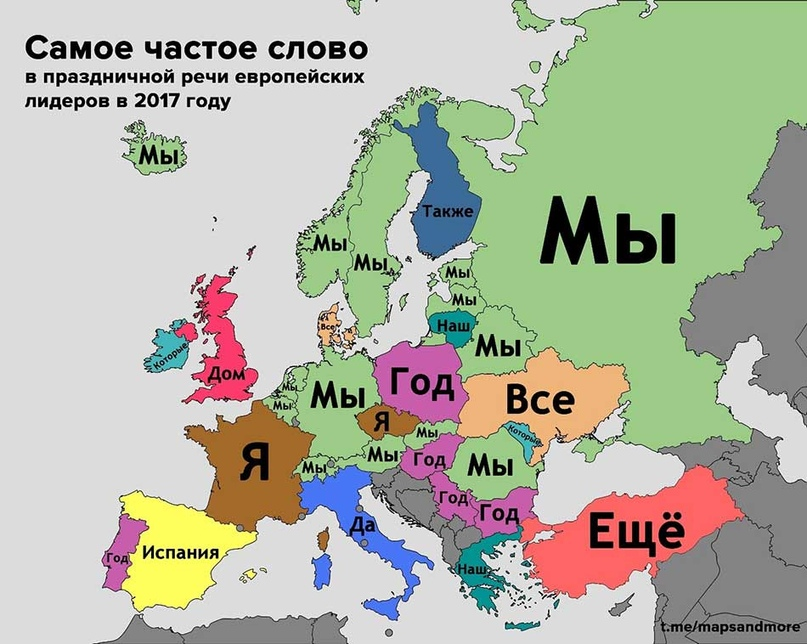 Частотный анализ новогодних/рождественских выступлений европейских лидеров от телеграм-канала Maps & Data. Самым частым словом оказывается «Мы» — в праздничных речах политики пытаются создать чувство общности у сограждан. Интересен выход слова «Дом» на первое место в Великобритании.