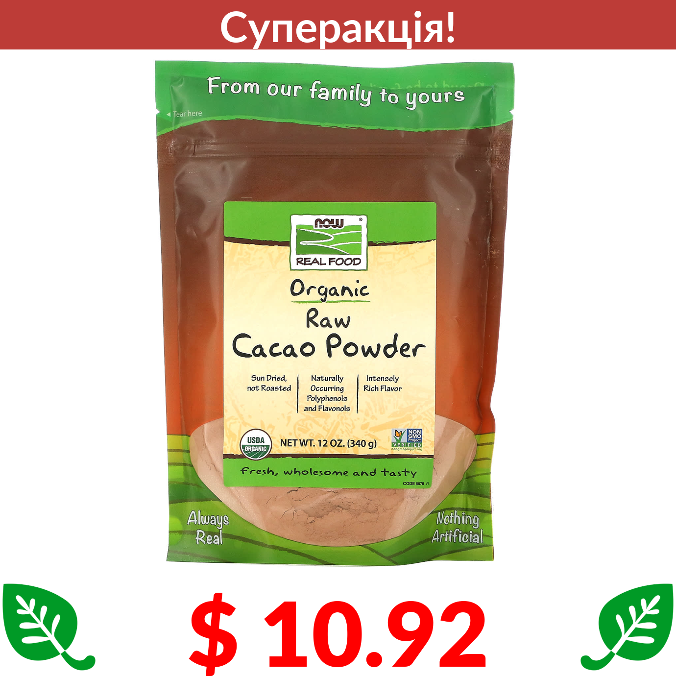 $ 10.92 Now Foods, Real Food, органічний необроблений какао-порошок, 340 г (12 унцій)