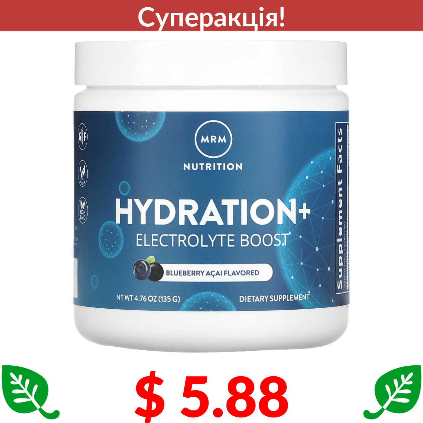 $ 5.88 MRM Nutrition, Hydration+, суміш електролітів, лохина та асаї, 135 г (4,76 унції)