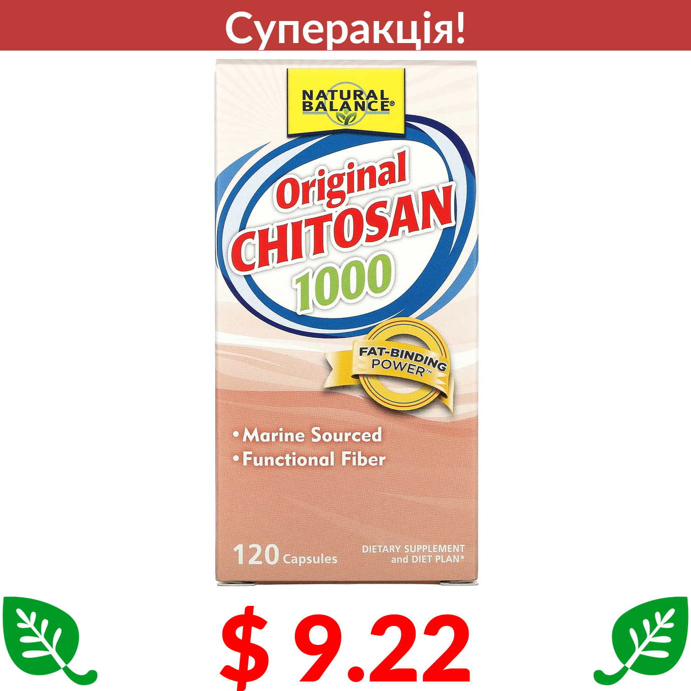 $ 9.22 Natural Balance, класичний хітозан, 250 мг, 120 капсул