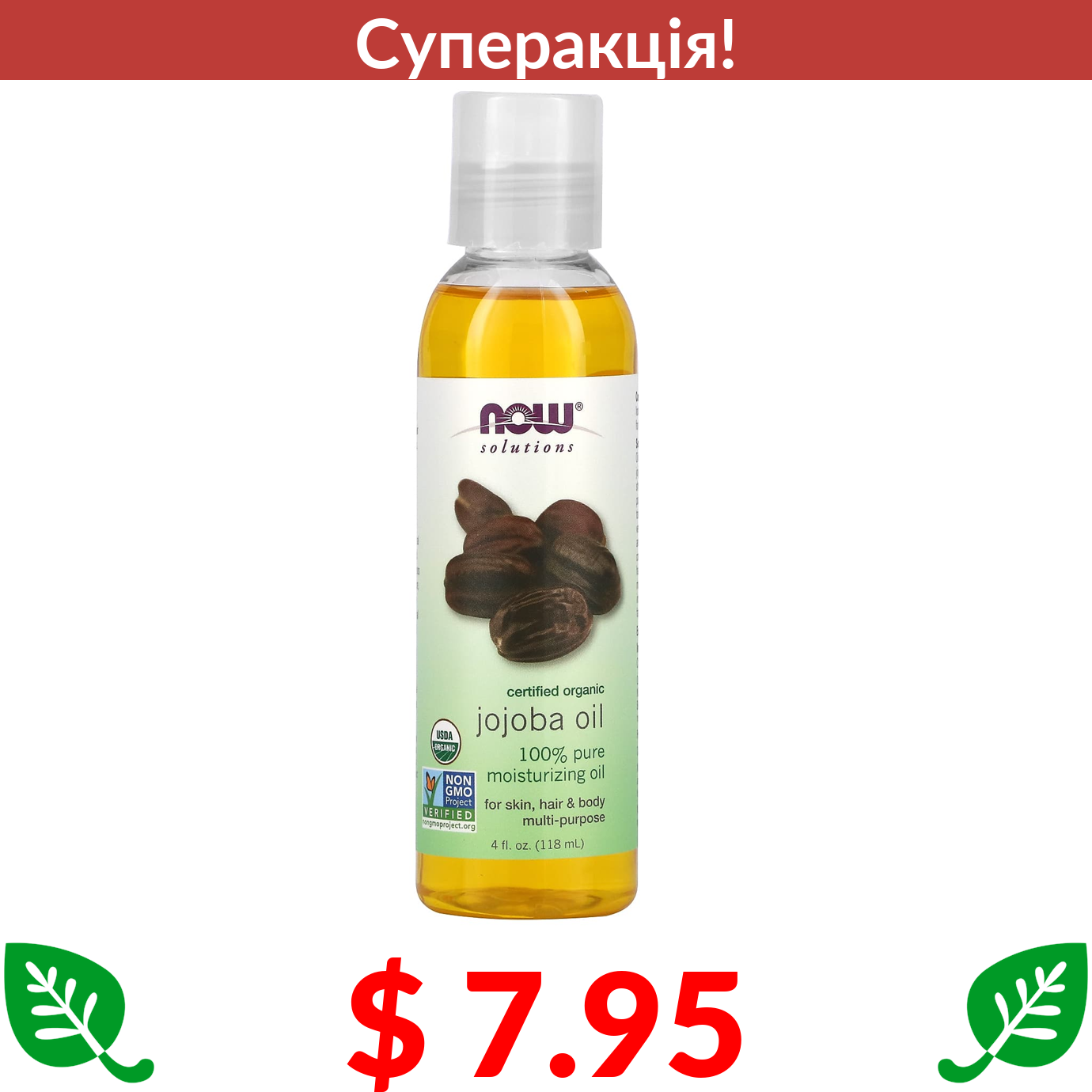 $ 7.95 Now Foods, Solutions, сертифікована органічна олія жожоба, 118 мл (4 рідк. унції)