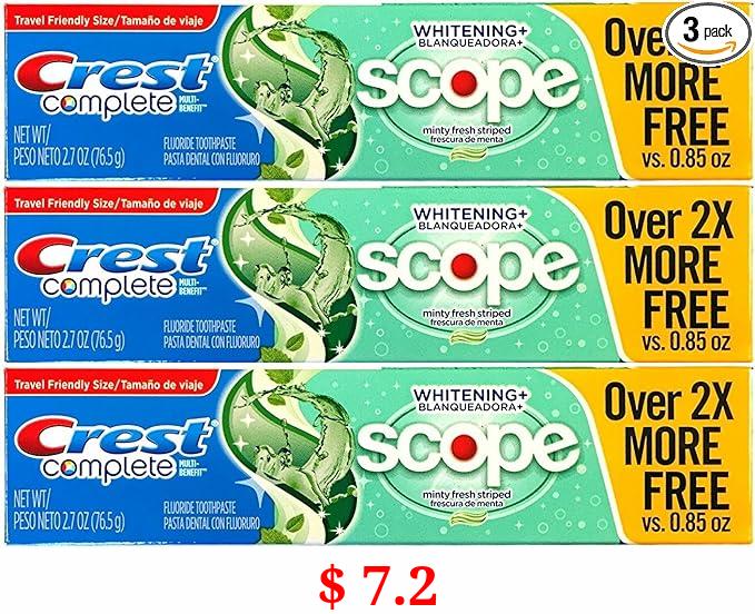 $ 7.2 Crest Complete Multi-Benefit Whitening + Scope Minty Fresh Flavor Toothpaste 2.7 Oz, Pack of 3