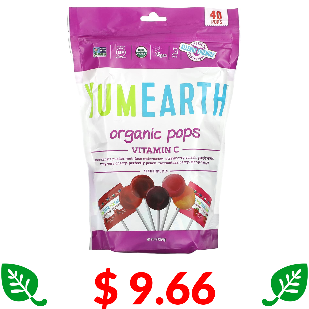 $ 9.66 YumEarth, Organic Pops, Vitamin C, Assorted, 40 Pops, 8.7 oz (248 g)