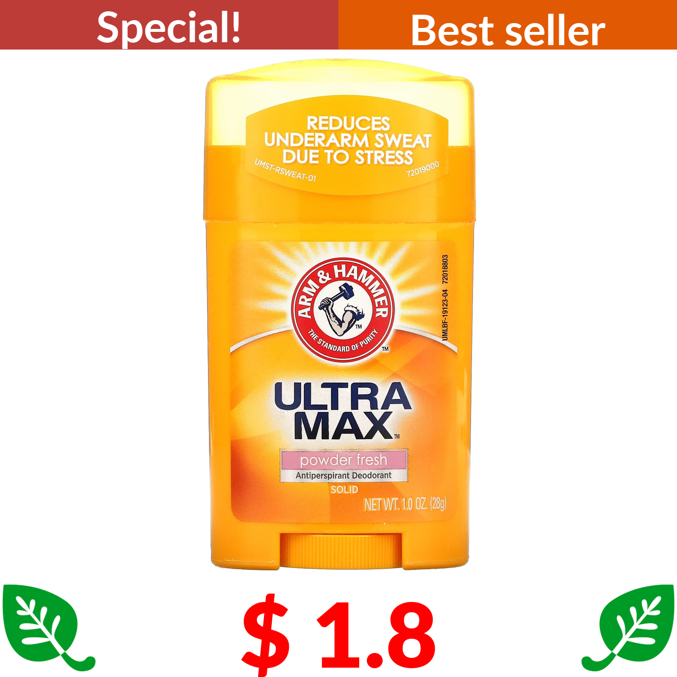 $ 1.8 Arm & Hammer, UltraMax, Solid Antiperspirant Deodorant, Powder Fresh, 1 oz (28 g)