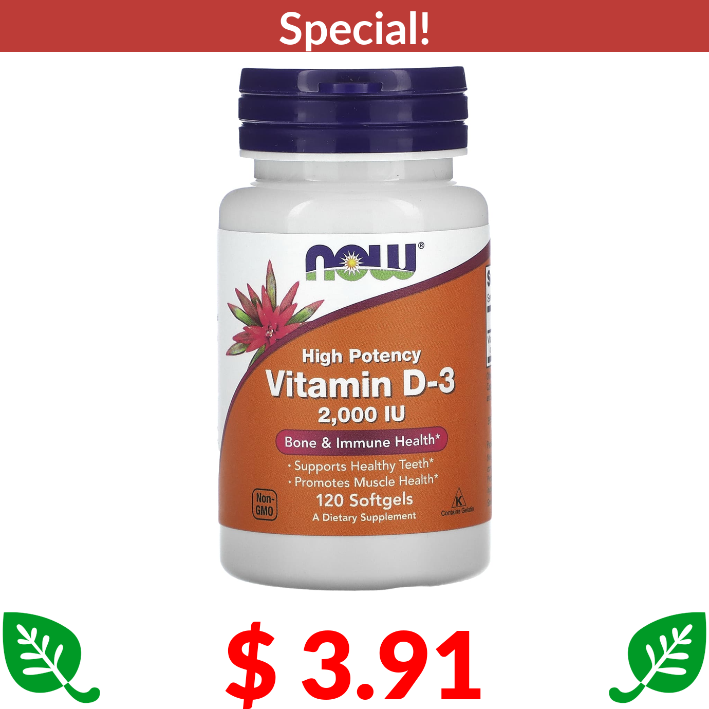$ 3.91 NOW Foods, Vitamin D-3, High Potency, 50 mcg (2,000 IU), 120 Softgels